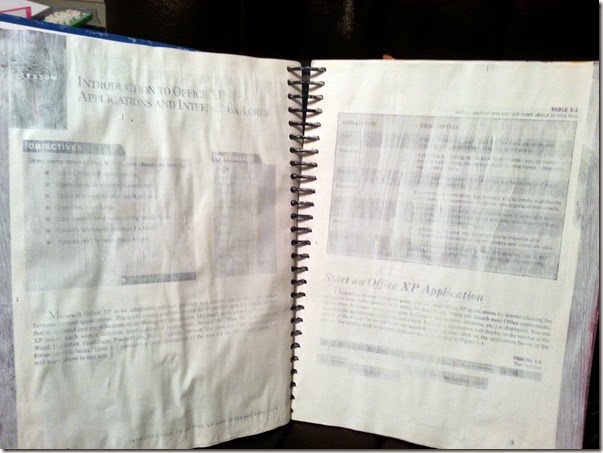 It’s an Office XP Basics Manual that someone donated and the great thing about it is it’s spiral bound, nice and big but not too big and I don’t feel guilty for gluing it’s pages together, gesso-ing the heck out of it and drawing and painting in it among other things. Here it is with a coat of gesso. I’ll add more gesso if needed when I use that page for a project. It just depends on what I am going to do with the page. I glued three pages together and then added a coat of white gesso. The nice thing I have learned is that the gesso is like a primer and makes the paper suitable for even watercolor painting. It gives it something for your medium to hang on to and absorbs the water from watercolor paints as well.